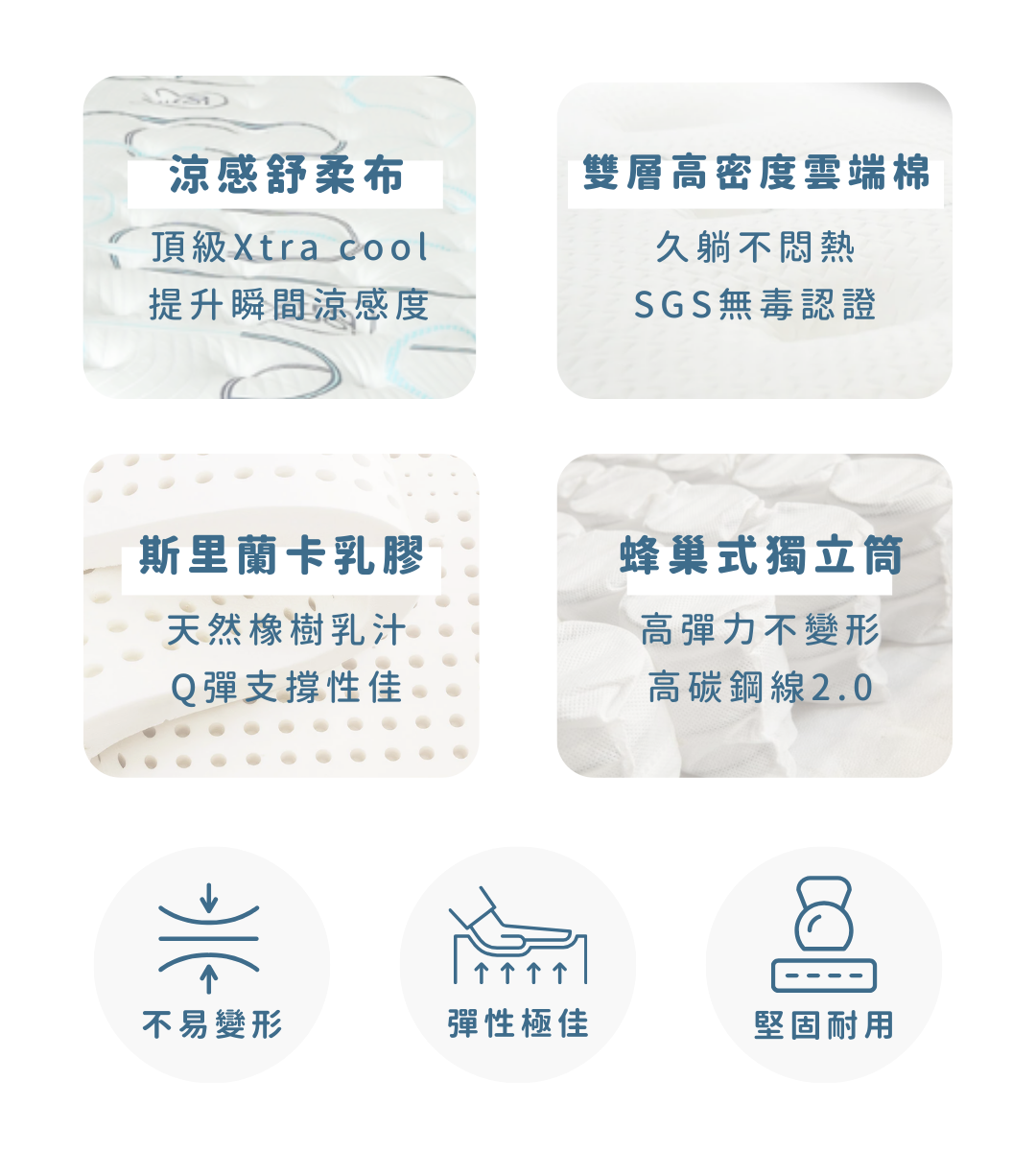 高效散熱、不變形,親膚性、防螨又抗菌、彈性極佳、堅固耐用 (購買永諾床墊,中鋼獨立筒保固十年)