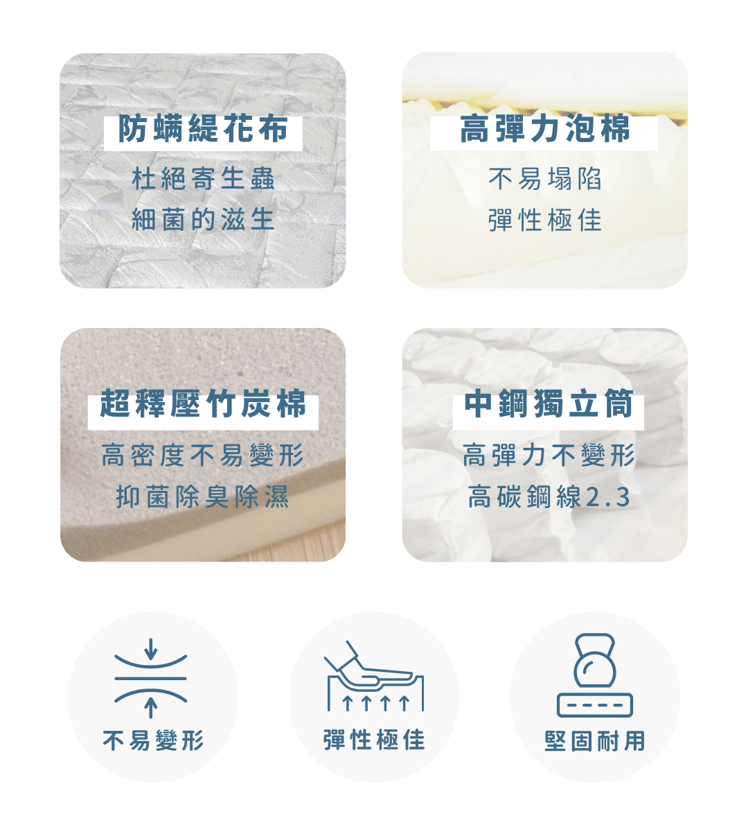 高彈力、不變形、防螨又抗菌、彈性極佳、堅固耐用 (購買永諾床墊,中鋼獨立筒保固十年)