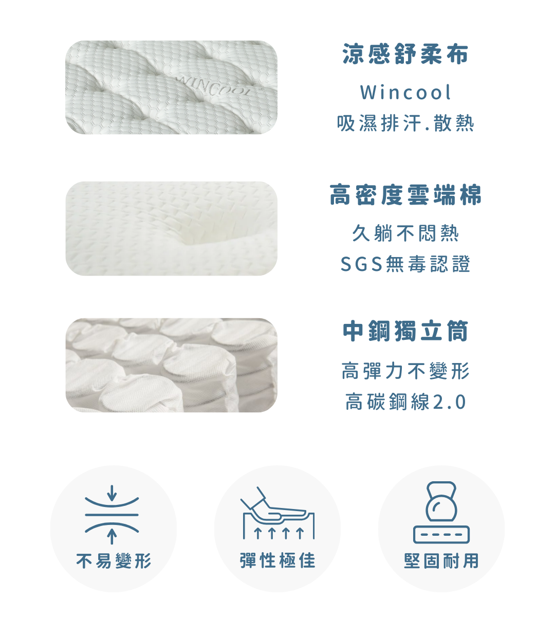 高效散熱、不變形,親膚性、防螨又抗菌、彈性極佳、堅固耐用 (購買永諾床墊,中鋼獨立筒保固十年)